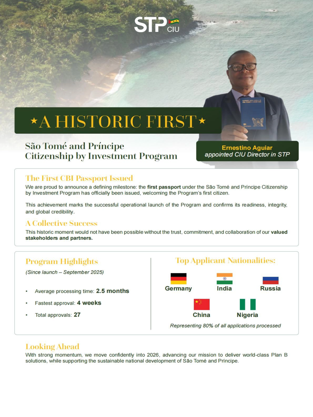 2026年1月,聖多美和普林西比投資入籍項目首本公民護照明順利獲批,標誌著項目流程已在真實個案中完成全鏈路驗證,正式進入成熟運營階段。